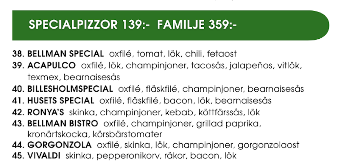 Samtliga pizzor innehåller mozzarellaost och tomatsås