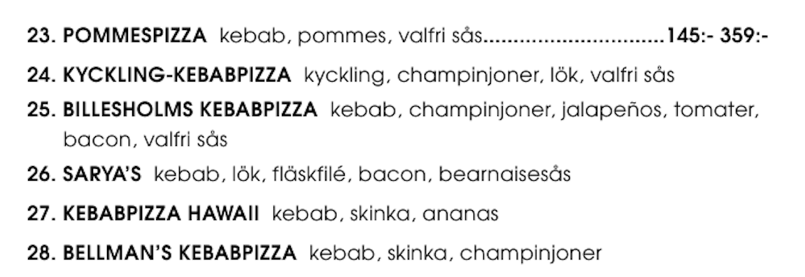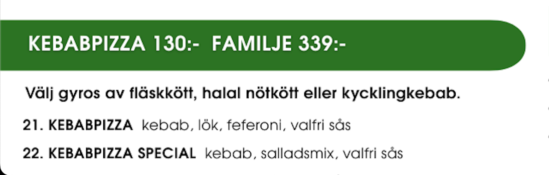 Det ingår feferoni och valfri sås/dressing till kebabpizzor.