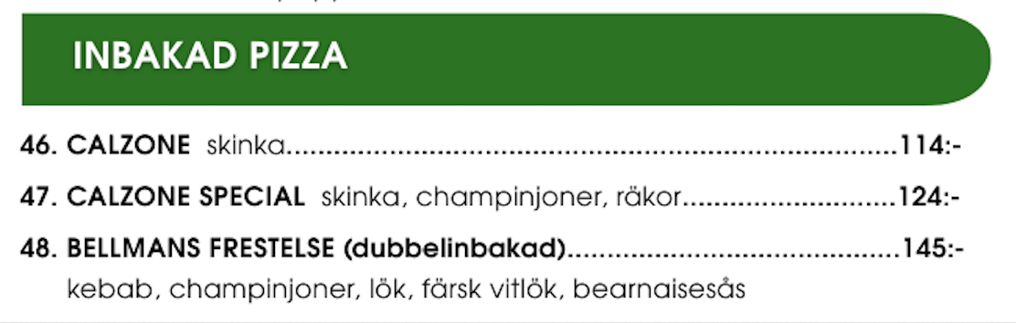 47. BELLMAN’S FRESTELSE skinka, kebab, champinjoner, valfri sås (dubbelinb.) 79:-